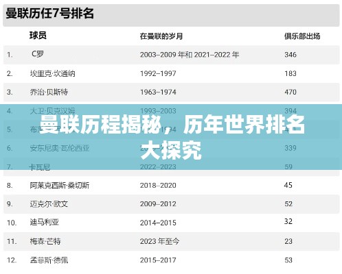 曼联,这支拥有辉煌历史的英格兰豪门球队,在全球范围内拥有广泛的影响力,其球迷群体庞大,战绩卓著,使得曼联成为了全球最具知名度和价值的足球俱乐部之一,曼联在历年的世界排名中表现如何呢?本文将为您详细解析。